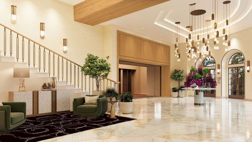 The 26 executive suites, complete with private patios or balconies, will feature elegant walnut wood accents complemented by polished silver metalwork and burnished brass elements, with alabaster block sconces adding a touch of luxury to entertainment areas.